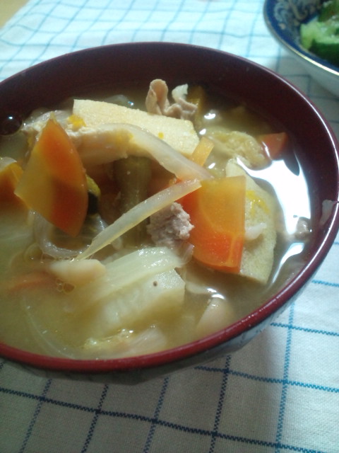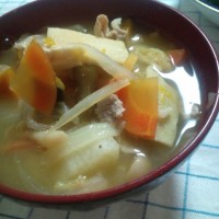 大根人参こうや豆腐玉ねぎ豚肉山芋ささげ豆が入ってます。