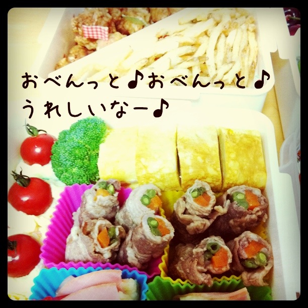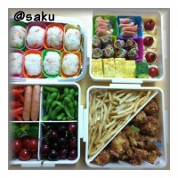 晴れました。 前日の夜、大雨が降って泣きそうになったけど(お弁当の下ごしらえが終わってたからね)、 当日は晴れてよかったわ。 運動会のお弁当を作るのも、来年でおしまいかなー? この他、ばばがイチゴと赤飯と山菜のにものを持ってきてくれたので、 盛りだくさんでした。