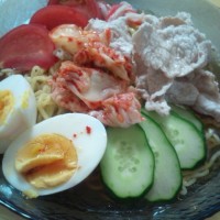 晩御飯は、冷麺が食べたかったけど、ざるラーメンの麺が安かったので、強引に冷麺風冷やし中華に。